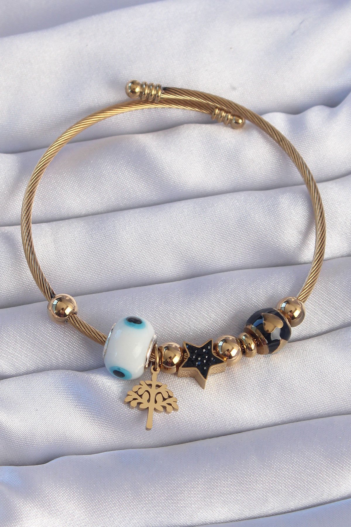 316L Çelik Gold Renk Siyah Zirkon Taşlı Yıldız Tasarımlı Ağaç Detay Nazarlı Charm Bileklik