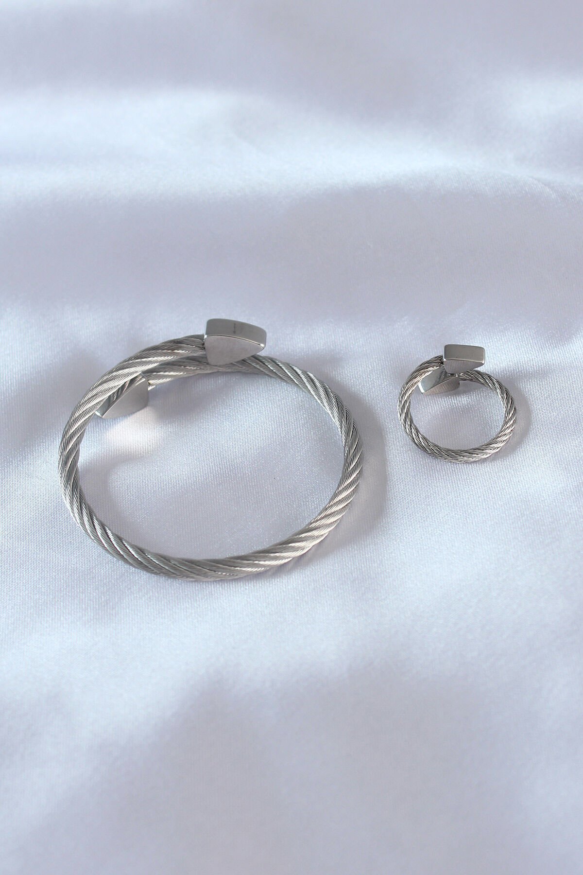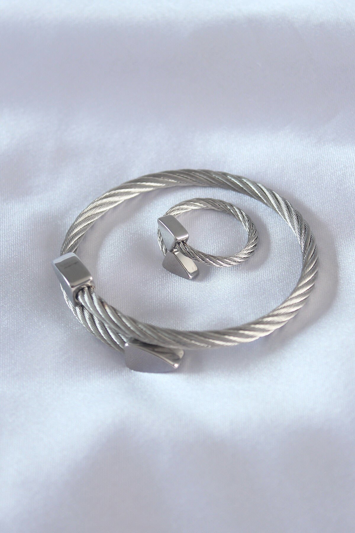 Çelik Gümüş Renk Burgu Model Erkek Bileklik Yüzük Seti
