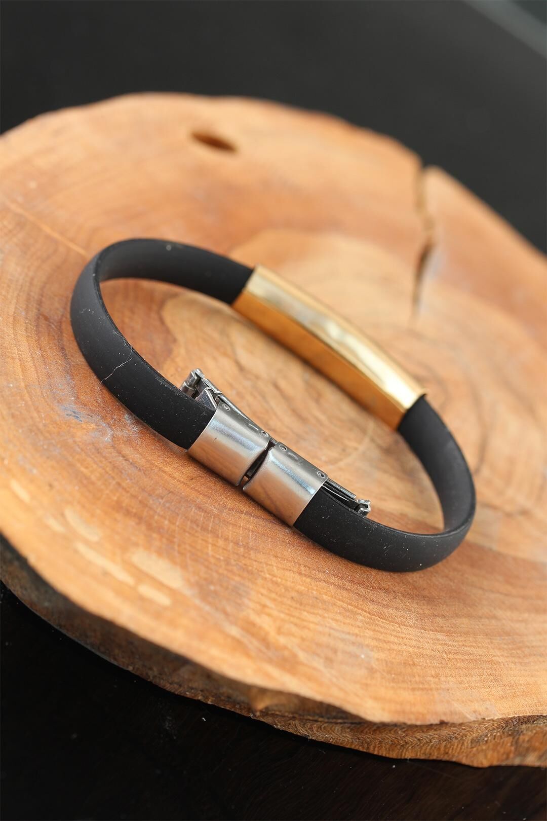 Havalı ve şık olmak için Gold Renk Çelik Yıldızlı Tasarım Siyah Renk Silikon Erkek Bileklik modeli uygun bir seçim olacak.