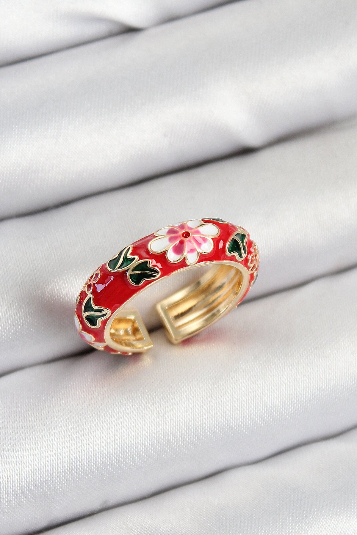 Pirinç Kırmızı Mineli Çiçek Motifli Gold Renk Ayarlanabilir Kadın Yüzük