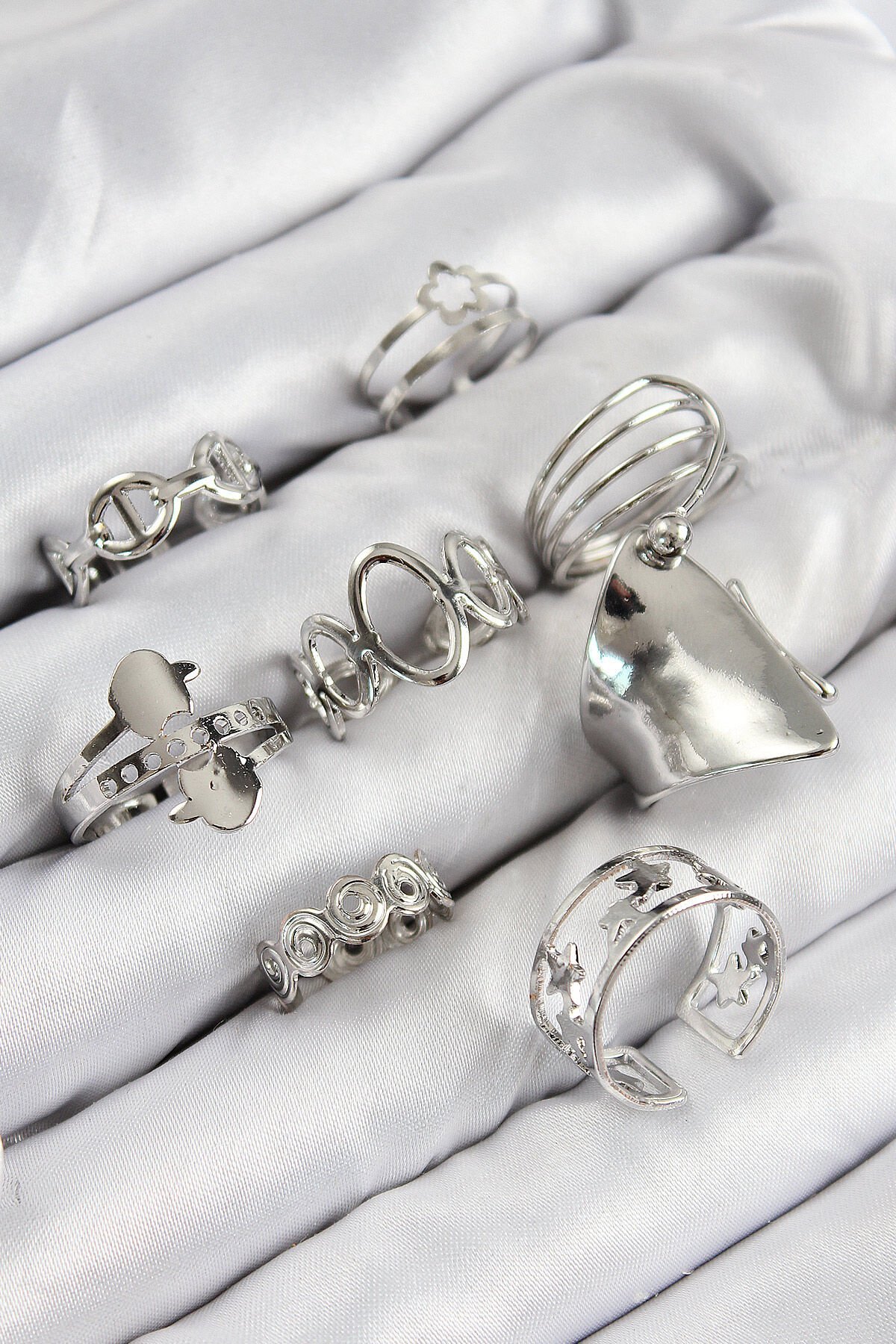 Pirinç Sarmal Ve Yıldız Model Gümüş Renk Kadın Yüzük Kombin Set