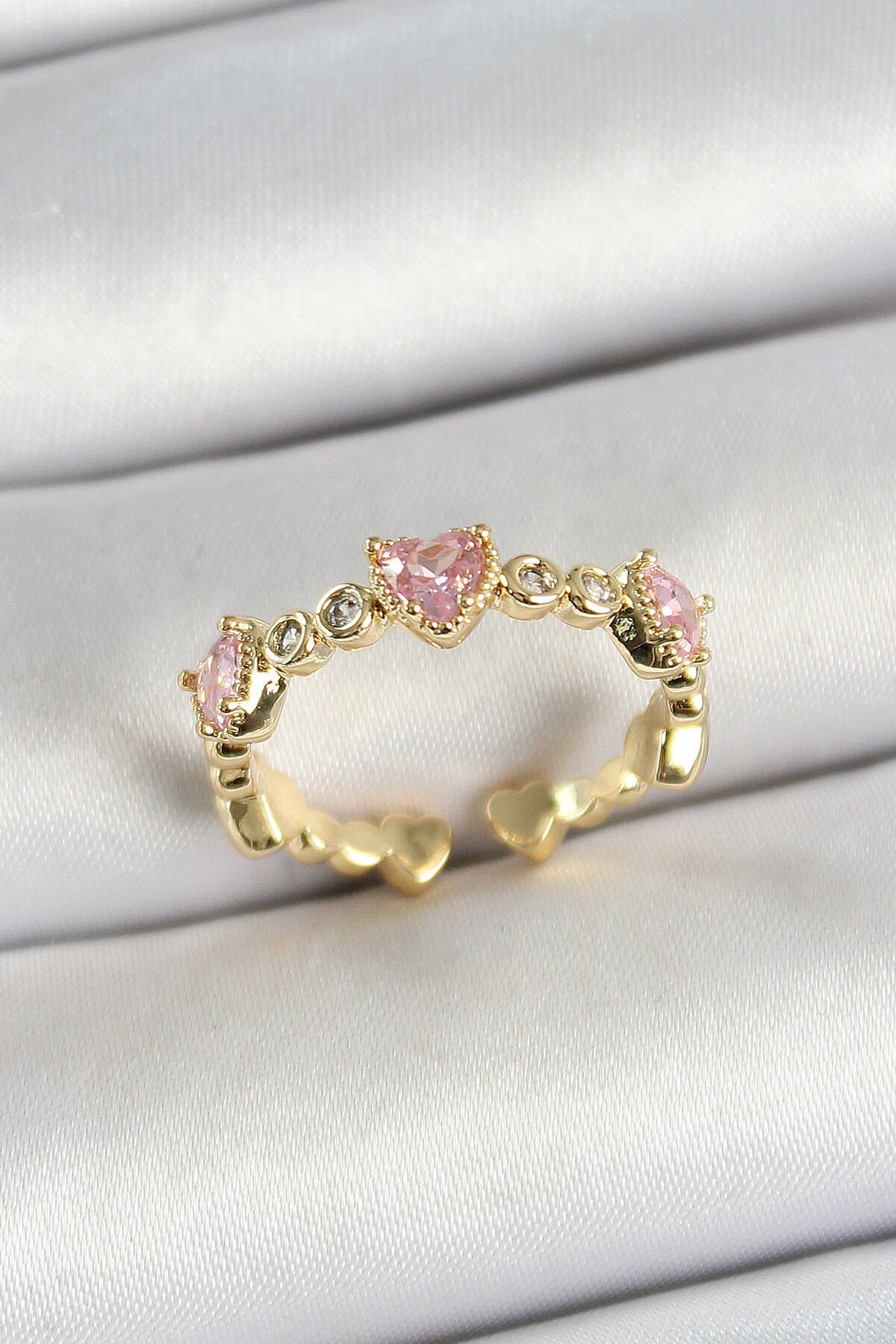 Pirinç Sıralı Kalp Figürlü Zirkon Taşlı Gold Renk Ayarlanabilir Kadın Yüzük