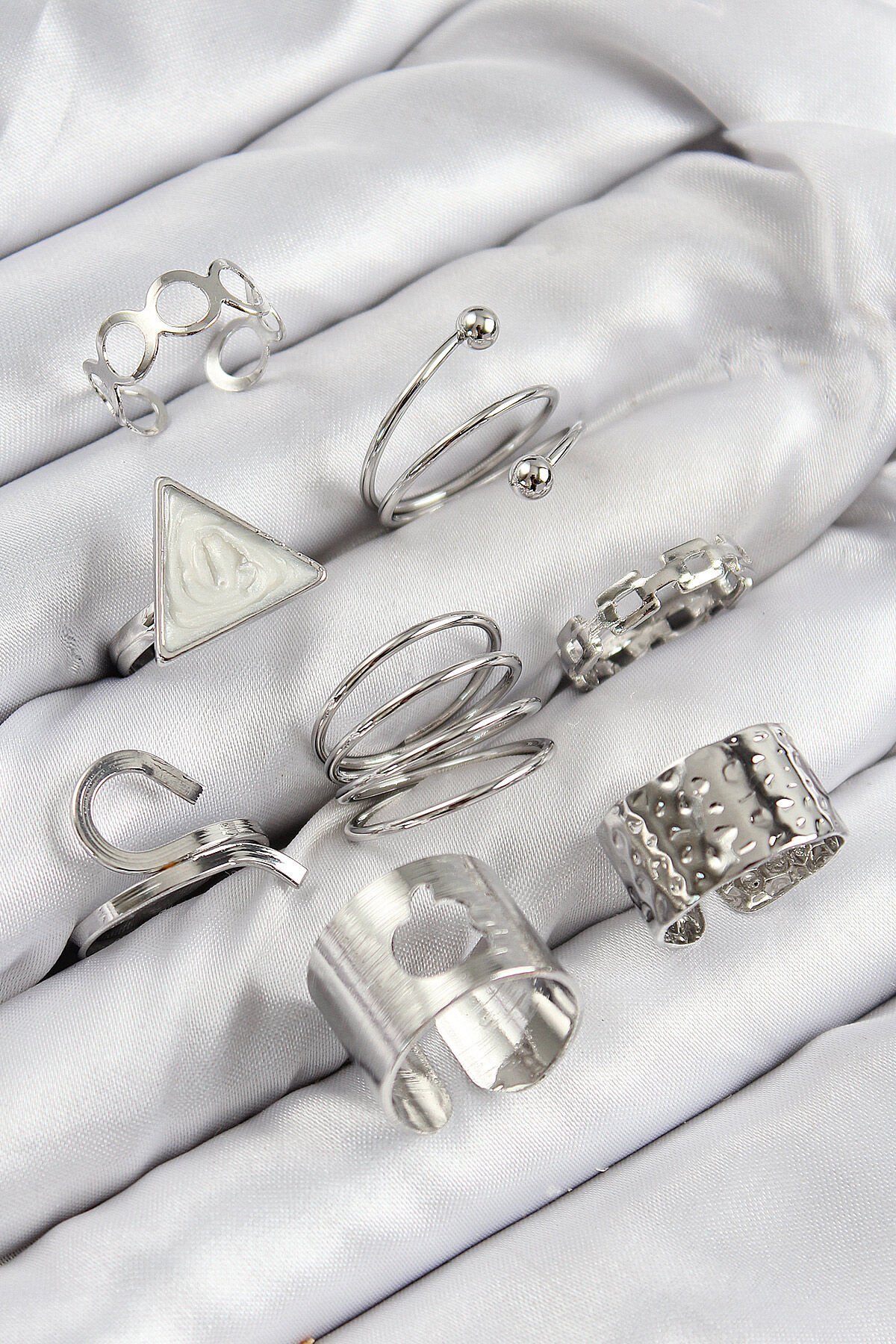 Pirinç Üçgen Model Gümüş Renk Kadın Yüzük Kombin Set
