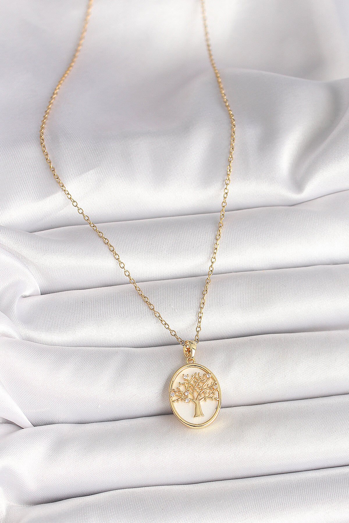 316L Çelik Gold Renk Zincir Zirkon Taş Detaylı Beyaz Mineli Ağaç İşlemeli Portre Model Kadın Kolye