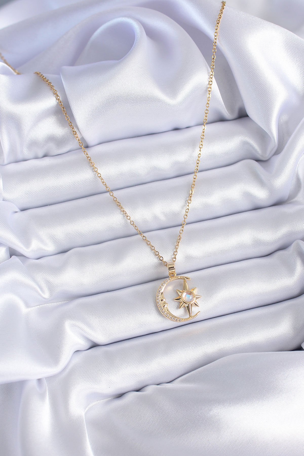316L Çelik Gold Renk Zirkon Taşlı Ay Yıldız Model Kadın Kolye