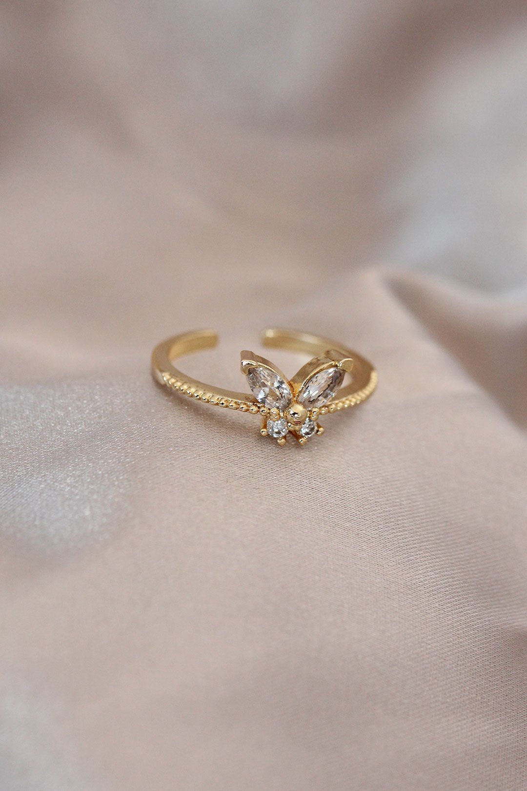 Ayarlamalı Altın Renk Metal Zirkon Taş ve Kristal Taşlı Kelebek Model Yüzük