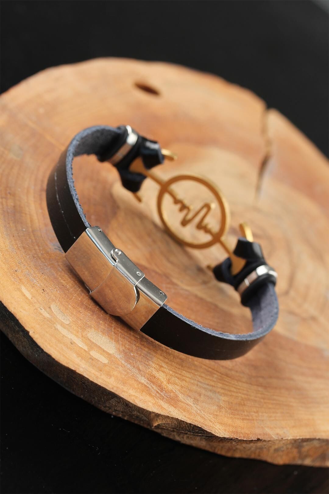 Gold Renk Metal Nabız Tasarım Siyah Renk Deri Erkek Bileklik