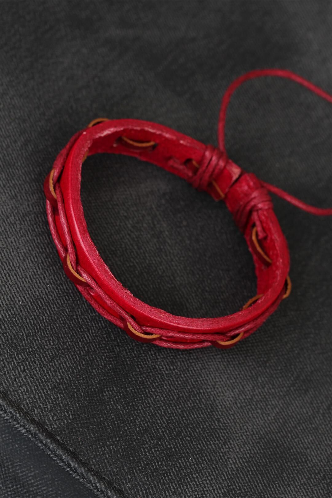 Kombinlerinizde Kırmızı Renk İpli Yeni Sezon Deri Erkek Bileklik modeline yer açın.