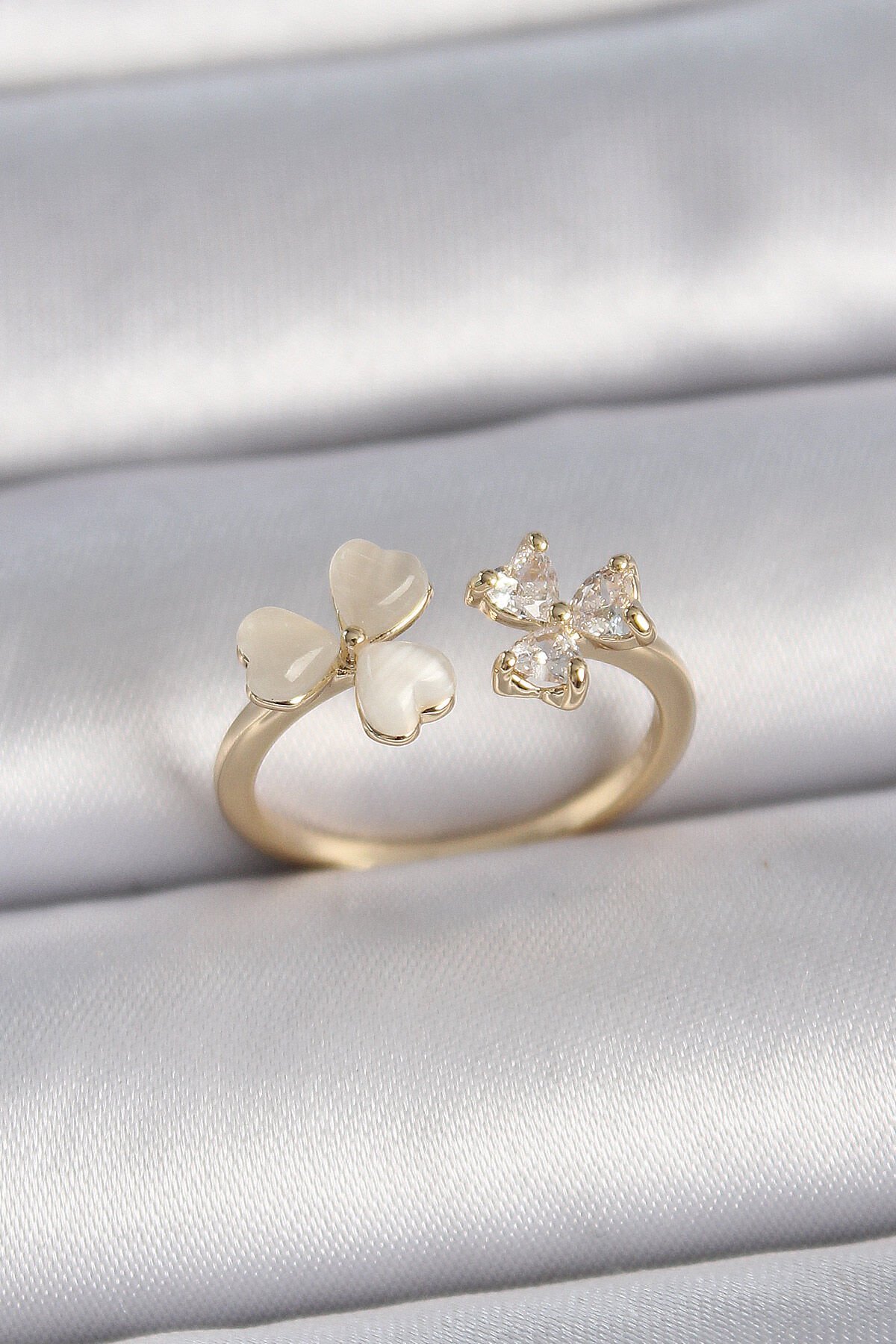 Pirinç Gold Renk Ayarlanabilir Zirkon Taşlı Kalp Beyaz Mineli Model Kadın Yüzük