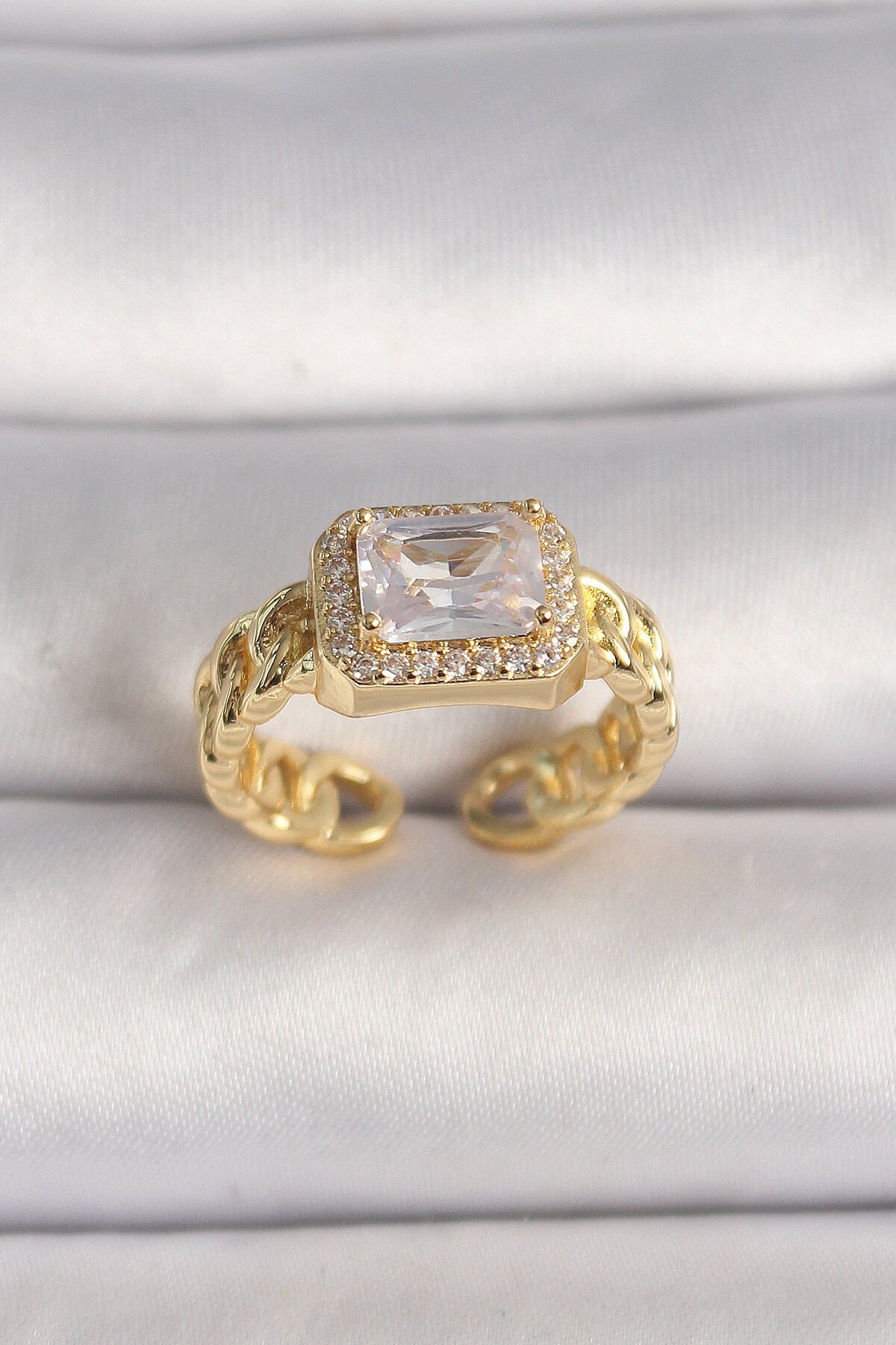 Pirinç Gold Renk Zincir Model Kare Zirkon Taşlı Kadın Yüzük