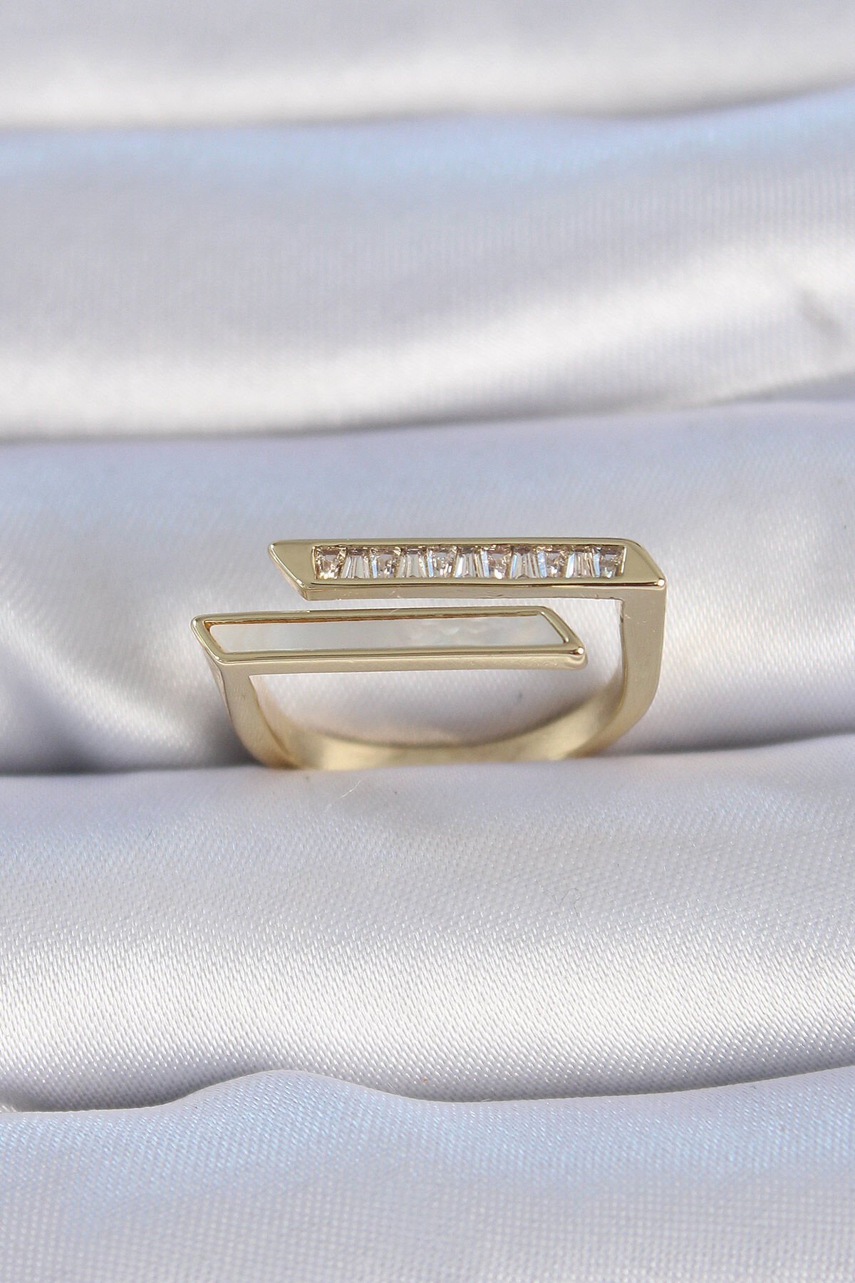 Pirinç Gold Renk Zirkon Taşlı Beyaz Sedef Detay Kadın Yüzük