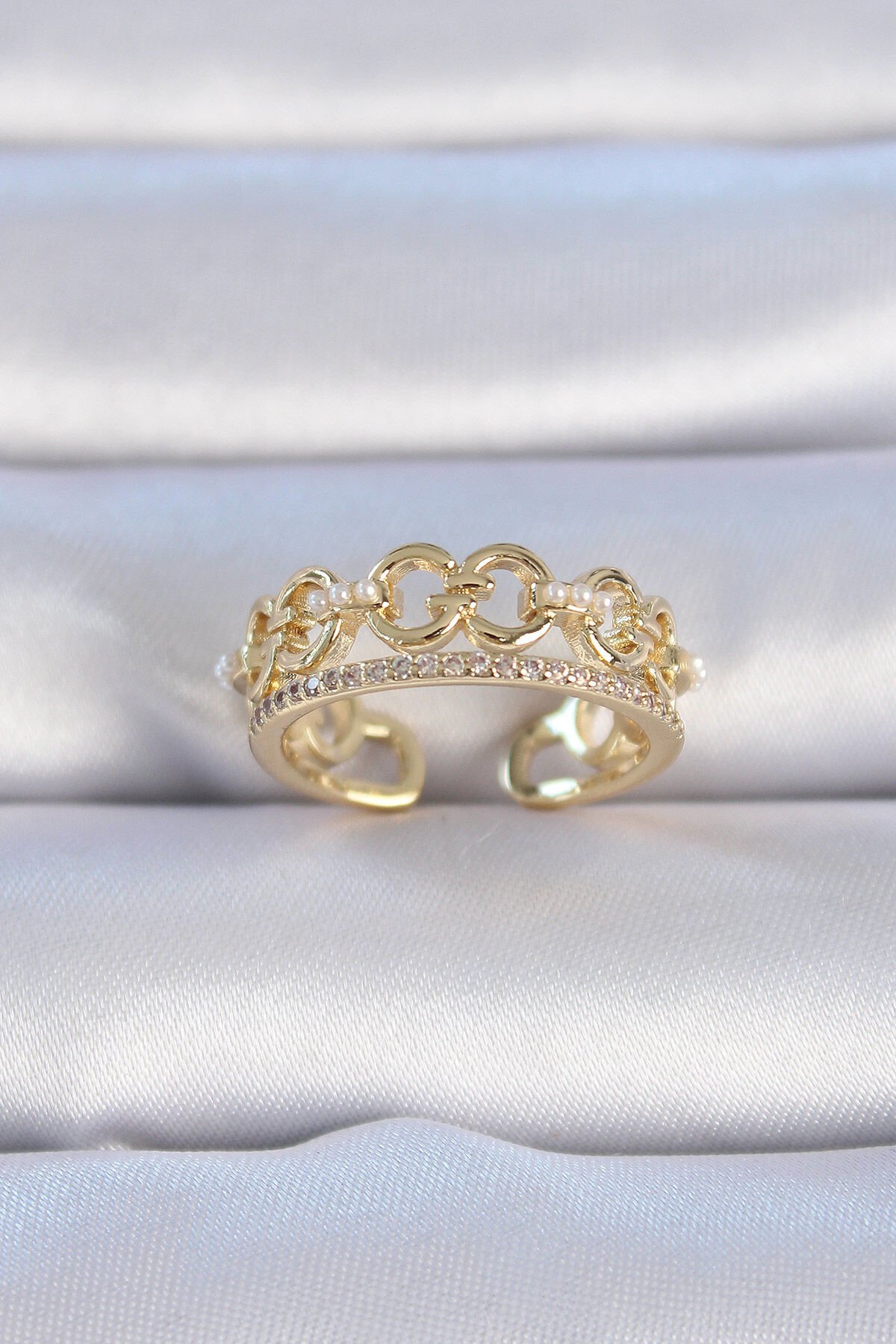 Pirinç Gold Renk Zirkon Taşlı İnci Detay Kadın Yüzük