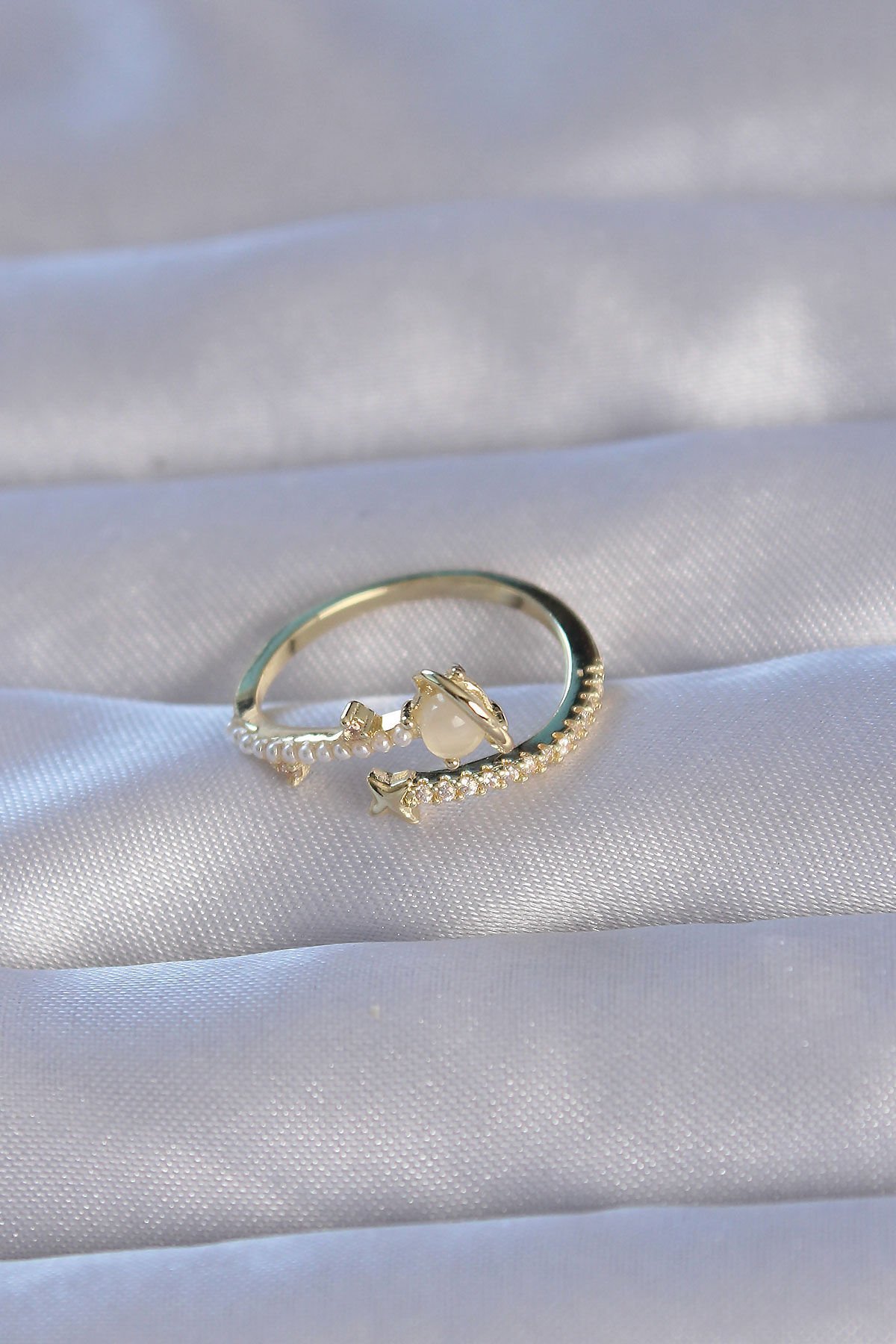 Pirinç Gold Renk Zirkon Taşlı İncili Satürn Model Ayarlanabilir Yüzük