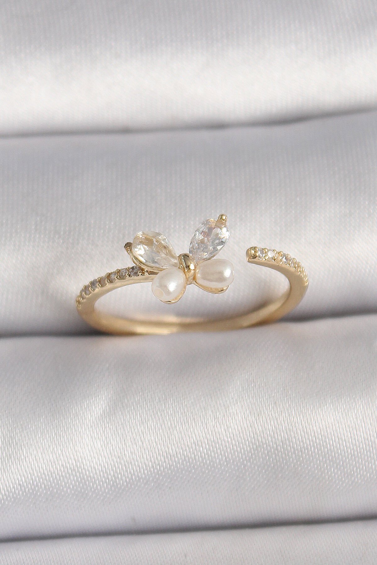 Pirinç Gold Renk Zirkon Taşlı Kelebek Mode İnci Detay Ayarlanabilir Yüzük