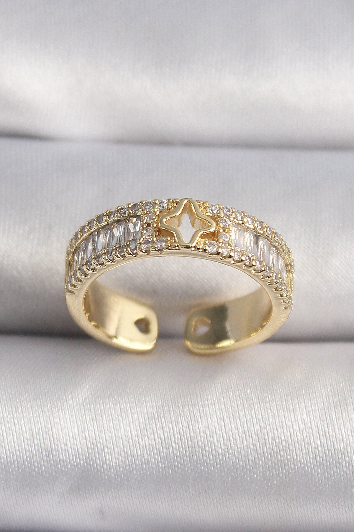 Pirinç Gold Renk Zirkon Taşlı Yıldız İşleme VIP Seri Kadın Yüzük