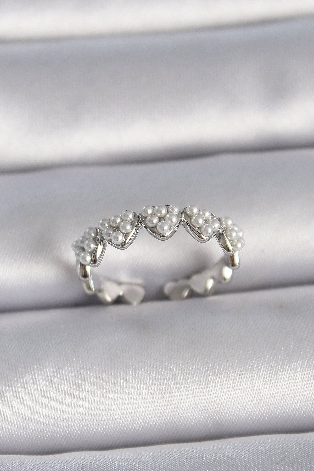 Pirinç Gümüş Renk Ayarlanabilir İncili Kalp Model Kadın Yüzük