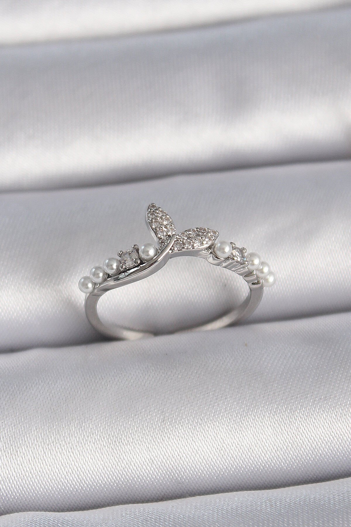 Pirinç Gümüş Renk Ayarlanabilir Zirkon Taşlı Balık Kuyruğu İnci Detay Model Kadın Yüzük