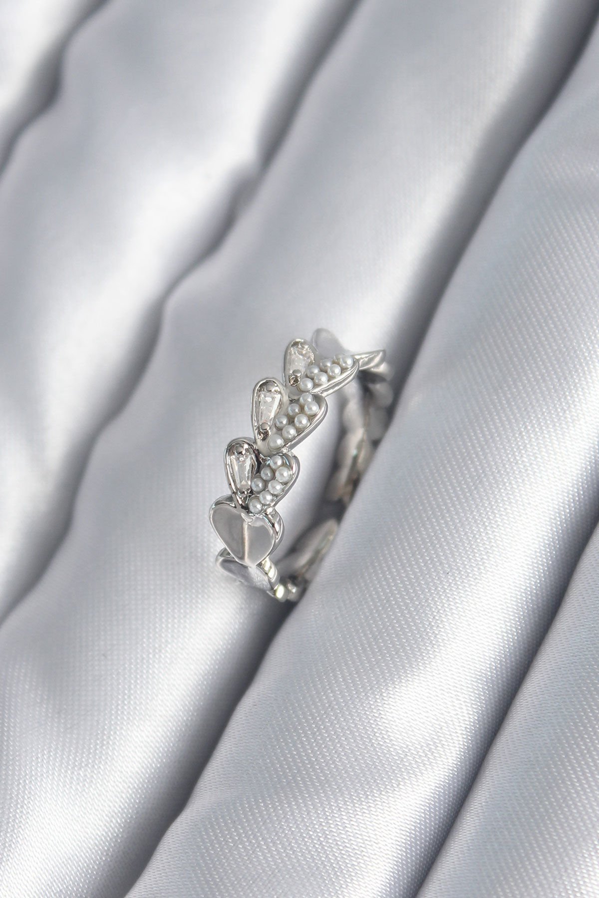 Pirinç Gümüş Renk Kalp Model İnci Detay Kadın Yüzük