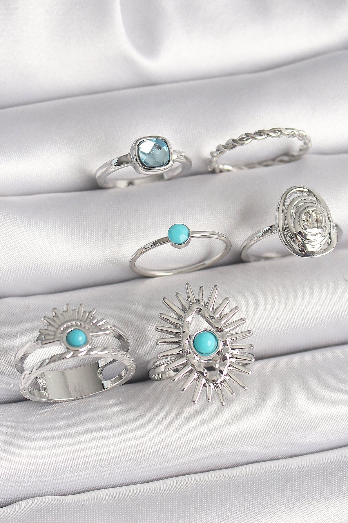Pirinç Gümüş Renk Mavi Taşlı Kare Zirkon Taş Detaylı Kadın Yüzük Kombini