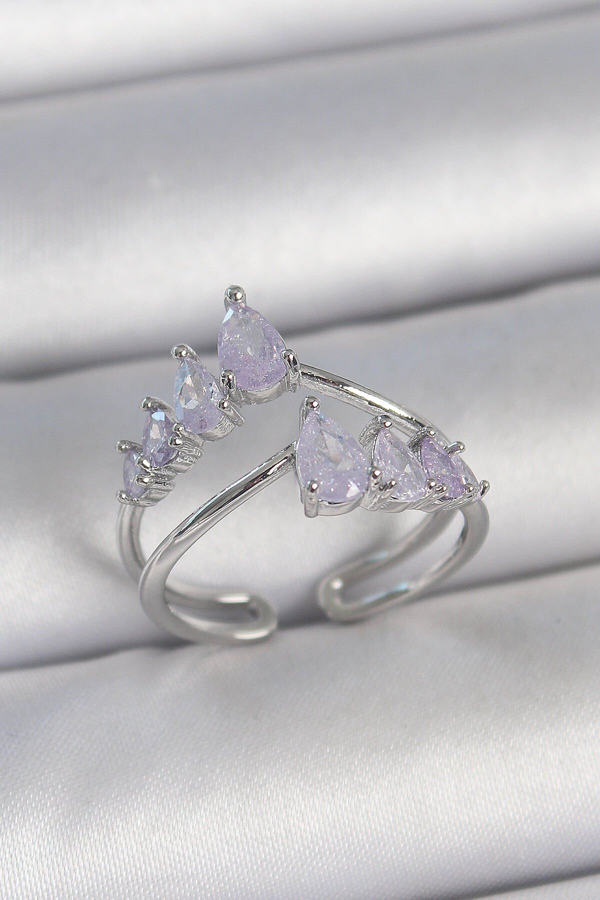 Pirinç Gümüş Renk Mor Damla Zirkon Taşlı Taç Model Kadın Yüzük