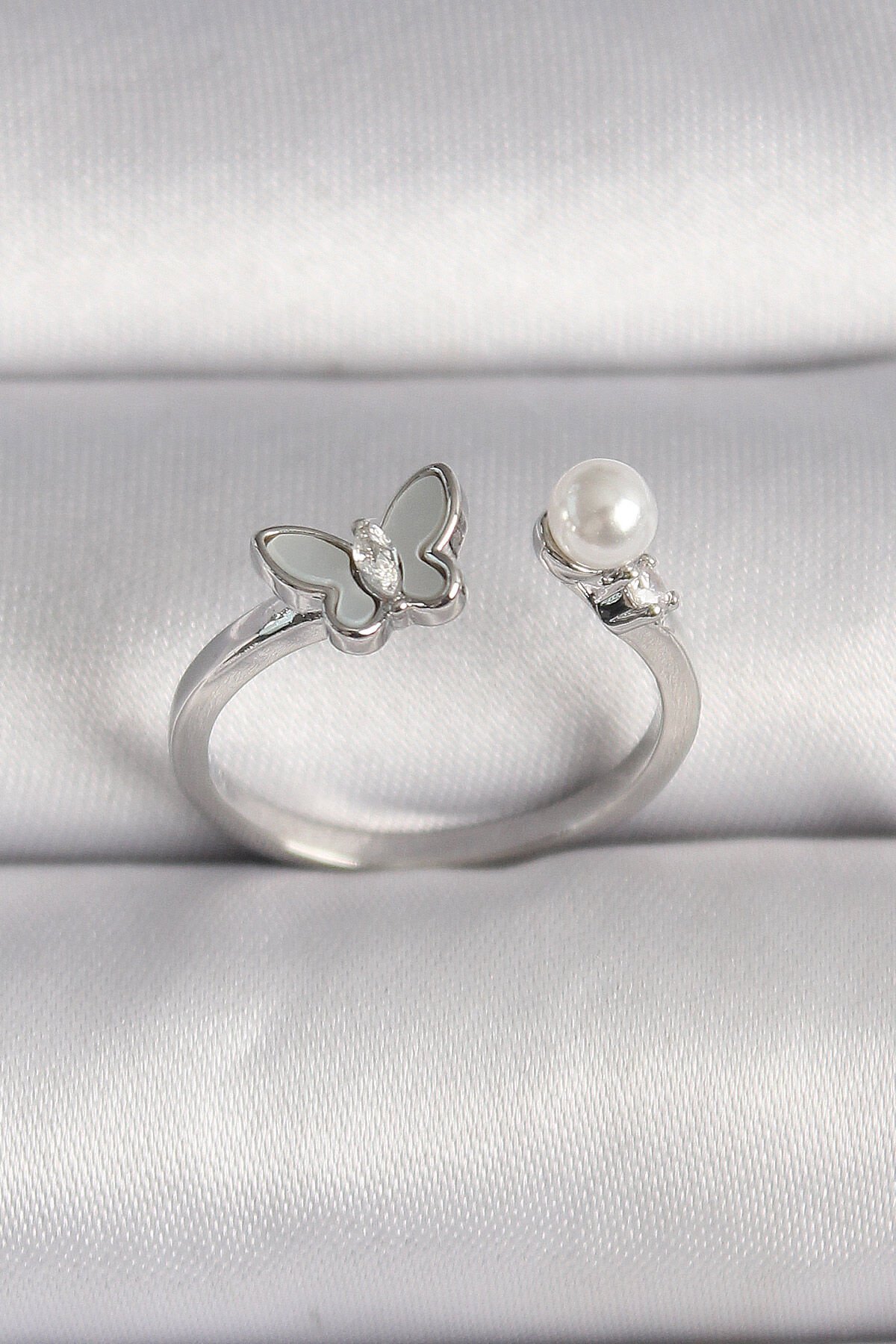 Pirinç Gümüş Renk Zirkon Taş Detaylı Beyaz Mineli Kelebek Figür İnci Detay Ayarlanabilir Yüzük