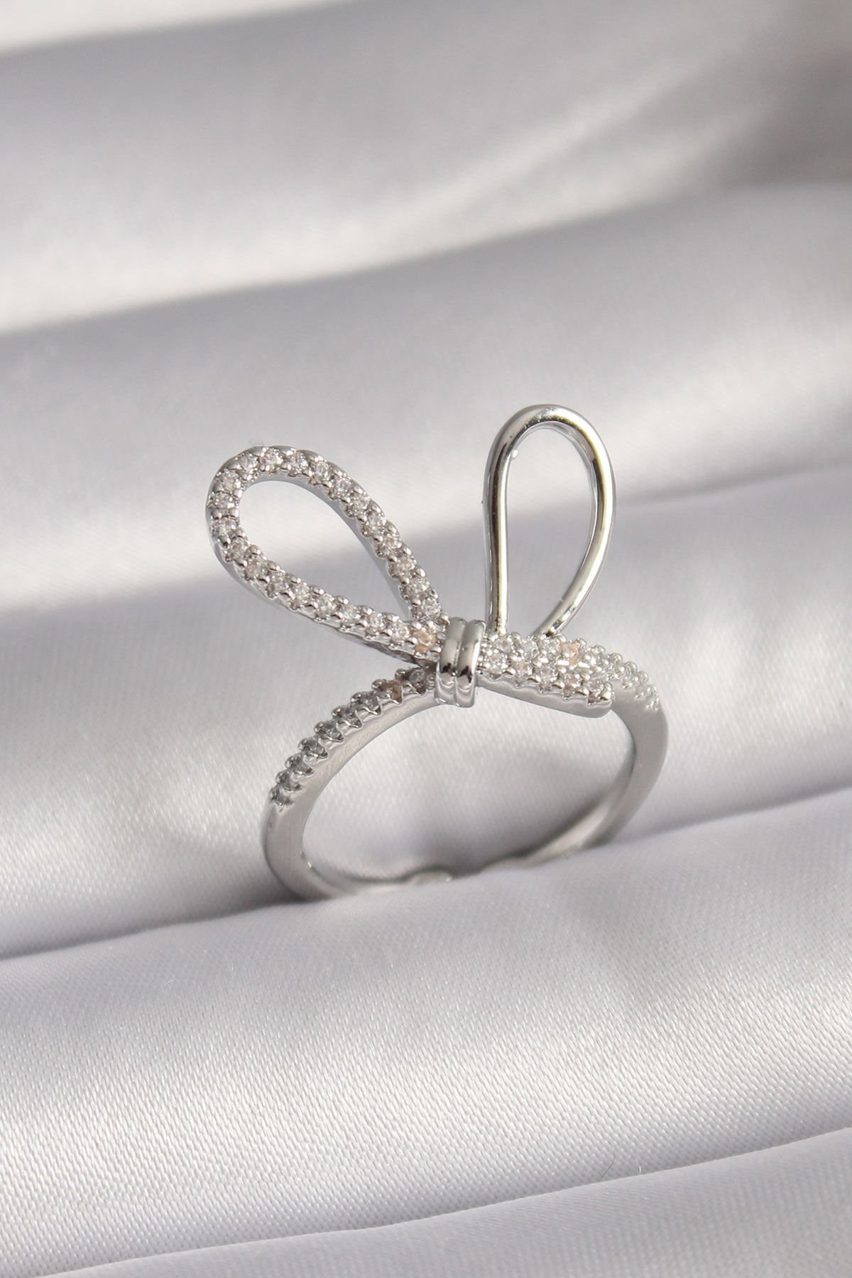 Pirinç Gümüş Renk Zirkon Taşlı Düğüm Model Kadın Yüzük