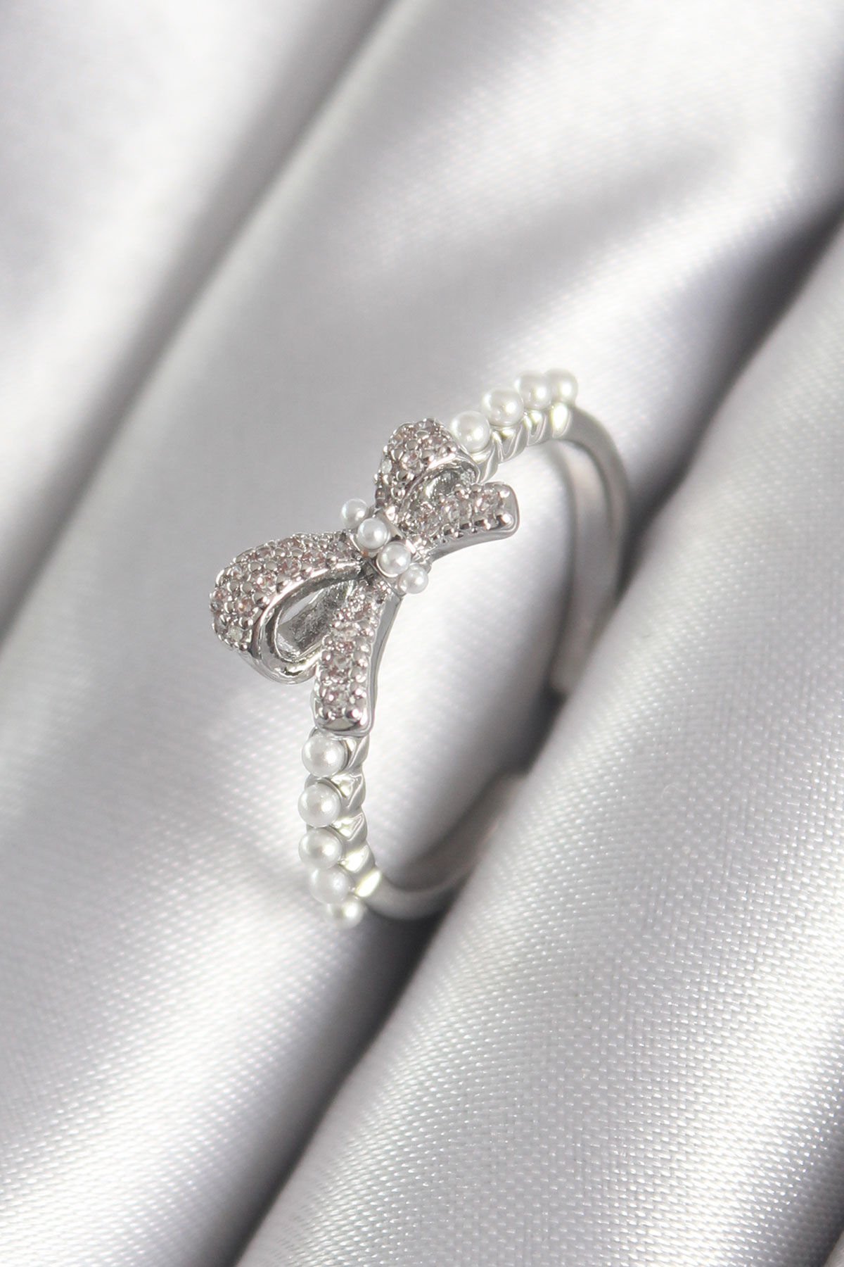 Pirinç Gümüş Renk Zirkon Taşlı İnci Detay Kadın Yüzük