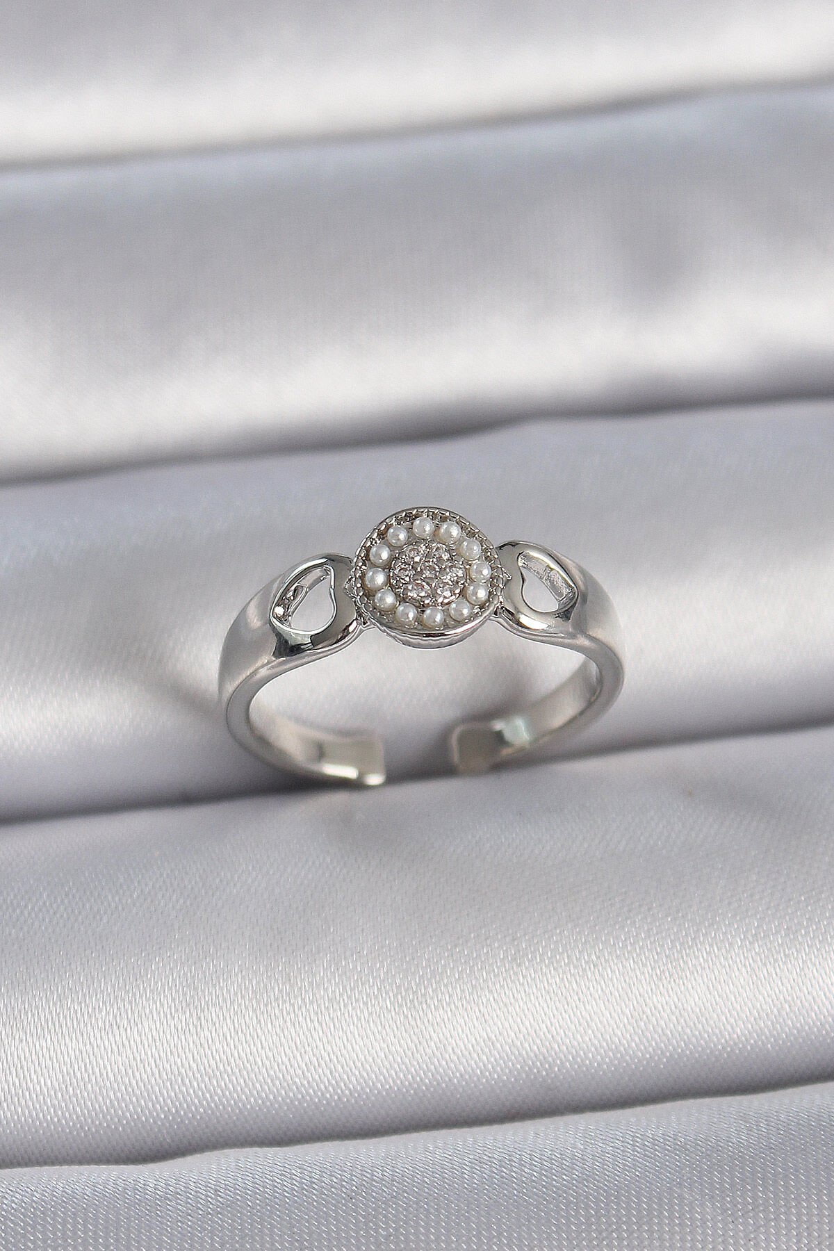 Pirinç Gümüş Renk Zirkon Taşlı İncili Kalp İşleme Detay Ayarlanabilir Model Kadın Yüzük